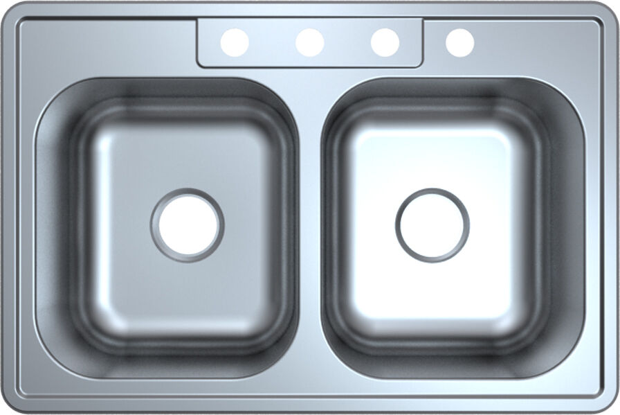 Description: Mainline MLTD332284 Brushed Satin 33 x 22in 4 Hole Double Basin Drop In/Self Rimming Stainless Steel Kitchen Sink. Used previously (and briefly) in-store as a display; product shows no signs of wear and tear. In original box with instructions and hardware in tact.