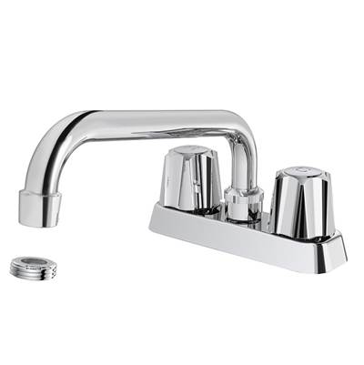 Description: Chelmsford Polished Chrome 2 Hole 4 in. Center-set Deck Mount Double Knob Handle Laundry Faucet. Used in-store for display; slight signs of corrosion. No box for product. Threaded aerator missing (standard aerator in it’s place).