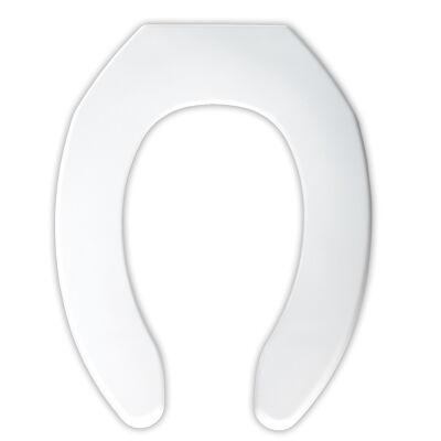Description: Mainline white elongated plastic, open-front toilet seat, commercial style, self-sustaining check hinge and stainless hardware included. Box damaged. No lid.